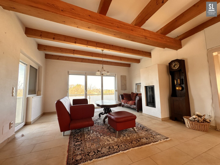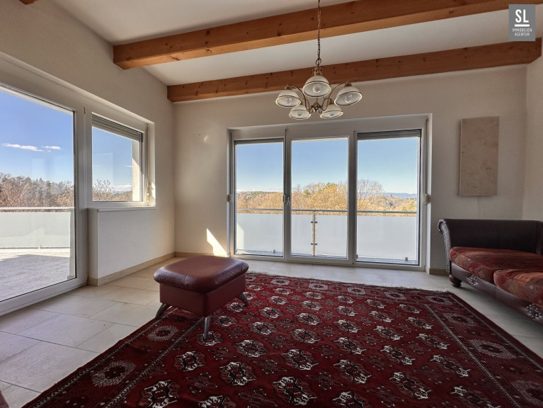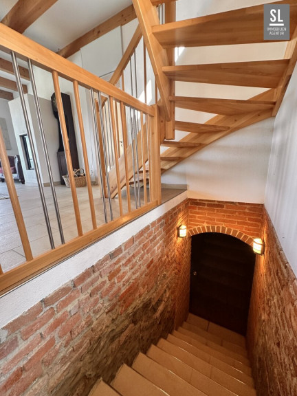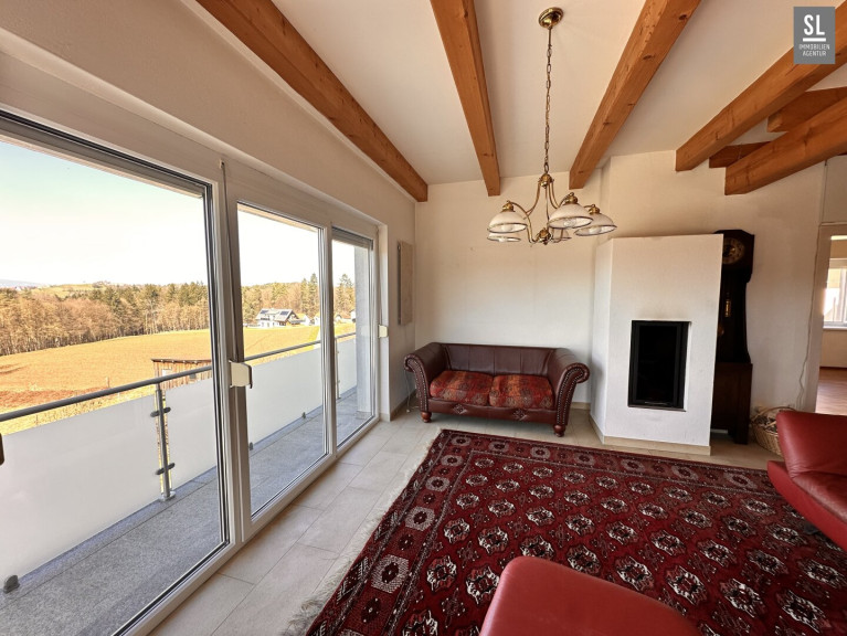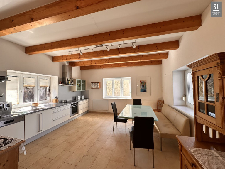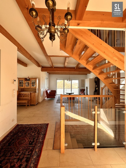 Treten Sie ein durch die schöne Massivholz-Eingangstür! Viele Holz-Deckenbalken und eine offene Raumgestaltung mit hoher Raumhöhe, schaffen eine sehr gemütliche Atmosphäre - die Bilder sprechen für sich - das alles kombiniert mit sehr schönen Fern-Ausblicken über das eigene Land Richtung Westen und noch weiter bis zur Koralm.
