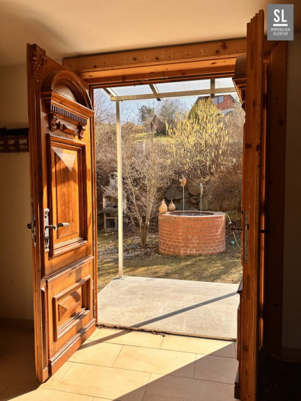 Durch die schöne Holzeingangstür gelangen Sie über einen offenen Vorraum links in eine große Wohnküche mit drei großen Fensterflächen, geradeaus in den Wohnbereich mit großer Fensterfront und dem modernen Kaminofen. Von hier aus können Sie auf den großen linken Teil der Westterrasse gehen. Angrenzend befindet sich ein weiteres geräumiges Zimmer mit großer Fensterfläche plus Fenster-Tür zum rechten Teil der großen Westterrasse. Das Gäste-WC mit Waschbecken ist gleich beim Eingang rechts. Kleine Nischen sorgen für Stauraum. UND - Nicht zu übersehen: Vom Vorraum gehen Sie über eine Stiege in den herrlichen Weinkeller, der mit einer Glas-Schiebetür zu verschließen ist.