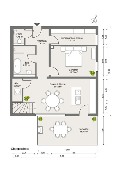 - Offenes Wohnen – ein lichtdurchfluteter Lebensraum mit direkter Verbindung zur großzügigen Terrasse, flexibel gestaltbar als zwei separate Räume