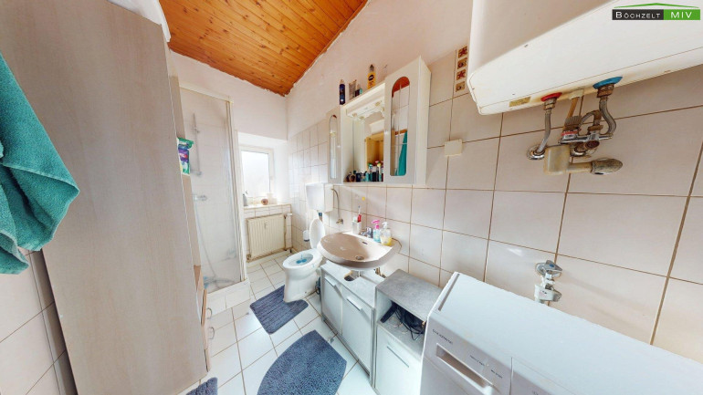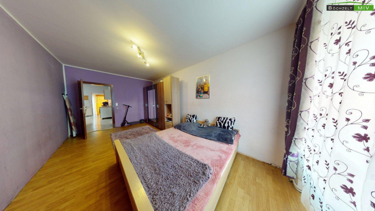 Beim Betreten der Wohnung gelangen Sie in einen zentralen Vorraum, der ausreichend Platz für eine Garderobe und Stauraummöglichkeiten bietet und von dem aus sämtliche weiteren Räume erschlossen werden. Das Badezimmer ist mit einer Dusche, einem WC und einem Fenster ausgestattet, wodurch eine natürliche Belichtung und Belüftung gewährleistet ist. Die Oberflächen sind mit Fliesen versehen und entsprechen einem einfachen, funktionalen Standard, der bei einer Renovierung gut modernisiert werden kann. Herzstück der Wohnung ist die Wohnküche, die als offener Wohn- und Essbereich genutzt wird. Hier finden sowohl eine Küchenzeile als auch ein Essplatz und eine gemütliche Sitzecke Platz. Von der Wohnküche aus gelangt man direkt auf den Westbalkon, der vor allem in den Nachmittags- und Abendstunden angenehme Sonnenstunden bietet. Der Balkon ist zusätzlich auch über einen Laubengang von außen erreichbar, was eine praktische alternative Zugangsmöglichkeit darstellt. Die Wohnung verfügt über zwei Schlafzimmer, die derzeit als Schlafzimmer und Kinderzimmer genutzt werden. Beide Zimmer sind gut proportioniert und bieten ausreichend Stellfläche für Bett, Kasten und weitere Möbel. Durch die Ausrichtung des Gebäudes in Ost-West-Richtung sind unterschiedliche Lichtverhältnisse im Tagesverlauf gegeben, wodurch sich die Räume angenehm nutzen lassen.