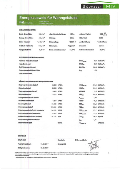 - Energieausweis: HWB 113,1 kWh/m²a (Klasse D), fGEE 1,51 (Klasse C)