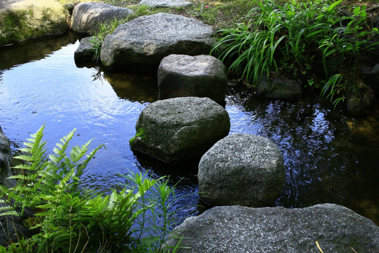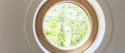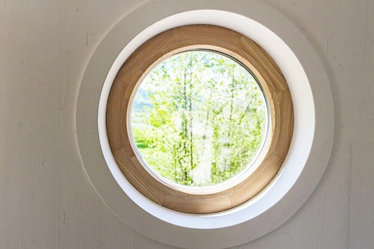 Ein Trittsteinpfad säumt zum Eingang Ihrer Terrasse, eine durchdachte Ergänzung, die ein Gefühl von Authentizität ausstrahlt. Türen und Fenster in runder und eckiger Form, verschmelzen mit der grünen Umgebung, während die Terrassentür die Verbindung zwischen drinnen und draußen bereichern. Die Terrassenfenster tauchen den Raum in ein natürliches Licht und betonen eine beruhigende Palette schlichter Farbtöne.
