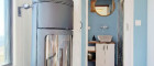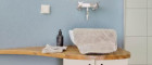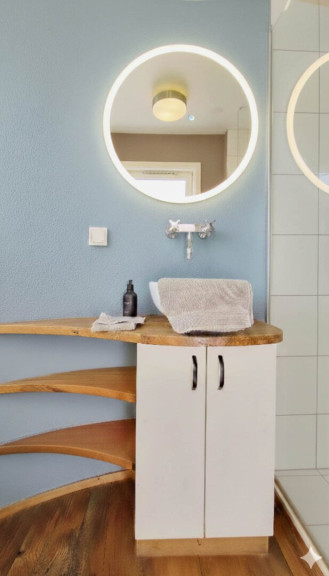 Ein separater Abstellbereich maximiert die verfügbare Grundfläche, während ein eigenes Bad auf dieser Ebene, mit einer Regendusche, einem WC und einen Holzschrank unter dem Waschbecken für zusätzlichen Stauraum, ausgestattet ist.