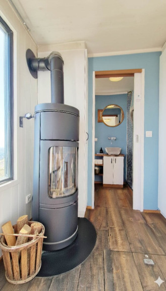 Ein stimmungsvoller Raum zum Essen oder Unterhalten, in dem Sie in den wärmeren Monaten die Türen öffnen oder den Holzofen anzünden können, wenn es kalt wird.