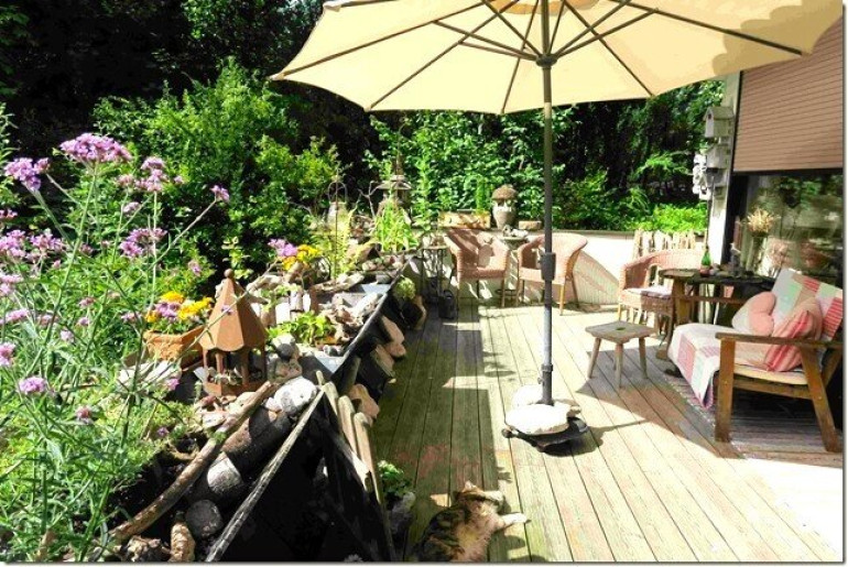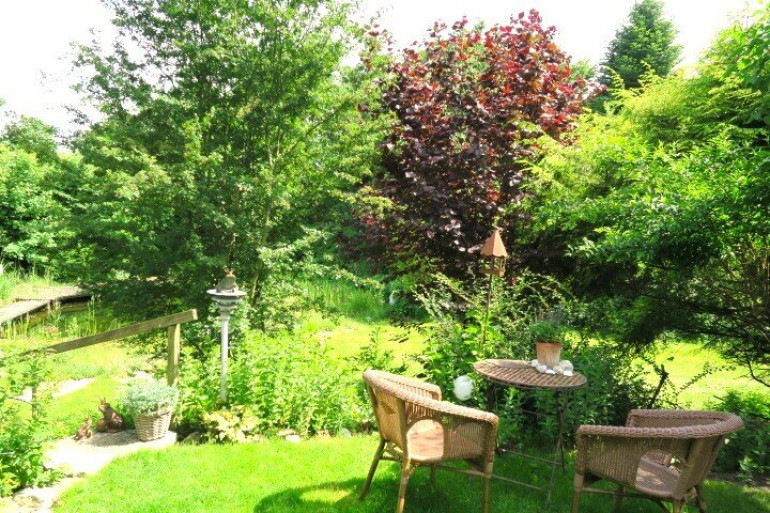 Im Garten befindet sich eine mit einer Pergola überdachte Holzterrasse, vom Balkon kann die Tier- und Pflanzenwelt eines angrenzenden kleinen Weihers beobachtet werden.
