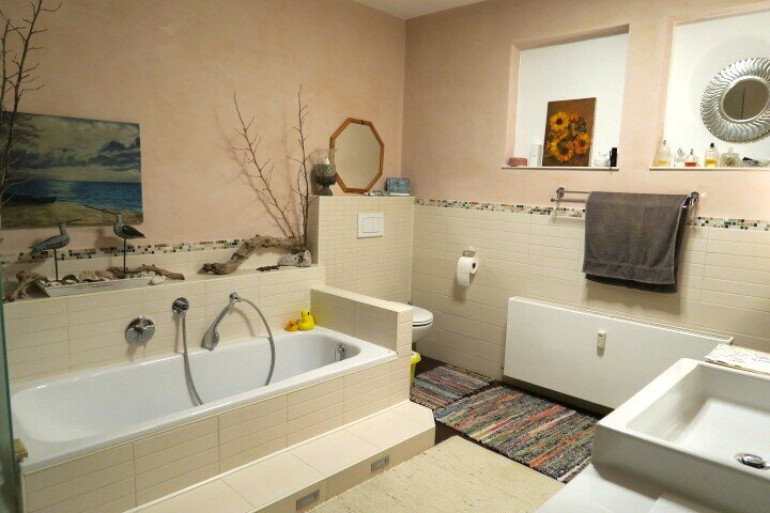 - Badezimmer mit Dusche, Wanne, Waschtisch, Bidet und Toilette