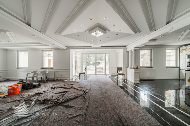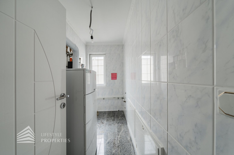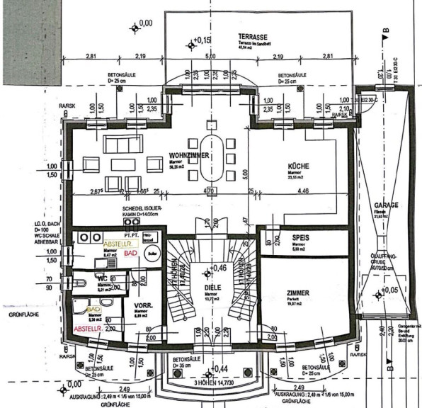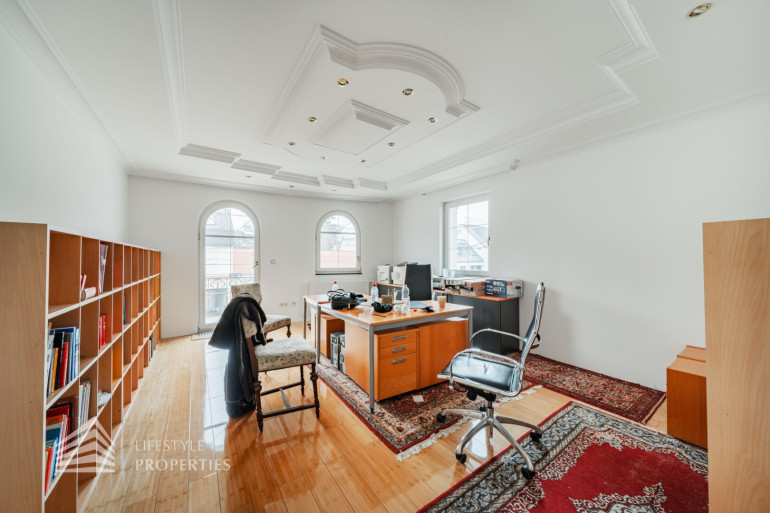 Beim Betreten der Villa gelangen Sie in das Erdgeschoß und einen einladenden Vorraum, welcher Sie in die Räumlichkeiten dieser Etage führt. Zunächst befindet sich rechterhand ein helles ca. 19 m² großes Arbeitszimmer, welches aber auch wunderbar als Gästezimmer genutzt werden kann. Direkt gegenüber befindet sich ein kleiner Vorraum, der Sie zu dem ersten Badezimmer, einem separatem WC und einem Abstellraum führt. Gegenüber der Eingangstüre gelangen Sie in den geräumigen und großzügigen Wohnessbereich, welcher mit einer Größe von knapp 56 m2 besticht. Hier befindet sich außerdem die ca. 23 m2 große offene Küche. Der Wohnbereich bietet ausreichend Platz für einen einladenden Esstisch und ein großes gemütliches Sofa. Von hier aus gelangen Sie auf die knapp 46 m2 große Terrasse, welche Sie auch in den eigenen und ruhigen Garten führt.
