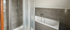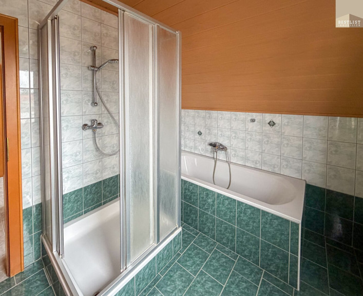 Ein Badezimmer mit Badewanne und Dusche sowie ein separates WC komplettieren diese Wohnebene und unterstreichen die durchdachte Planung des Hauses.