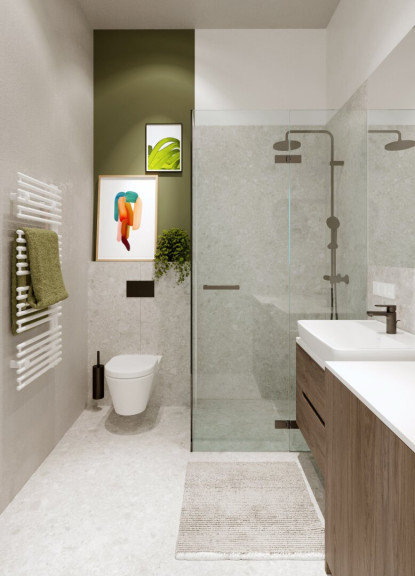 Das moderne Badezimmer überzeugt mit hochwertiger Ausstattung, einer bodentiefen Dusche sowie stilvollem Design.