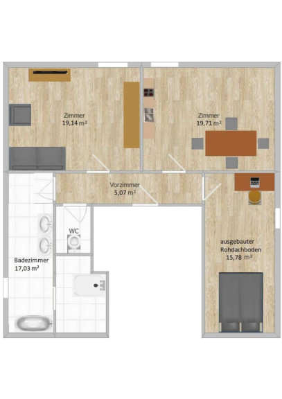Die Wohnung begeistert durch ihr einzigartiges Dachgeschossflair mit freiliegenden Holzträgern, die für eine warme und stilvolle Atmosphäre sorgen. Hier entsteht ein Wohngefühl, das sofort ins Auge fällt und zum Verweilen einlädt.