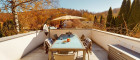Hinter dem Haus befindet sich die große Sonnenterrasse mit Platz zum Relaxen und Blick in den Grünbereich mit Sträuchern und Bäumen.