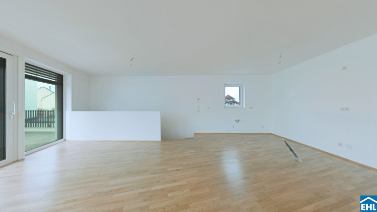 Die großzügige Wohnküche lädt zum gemeinsamen Kochen, Essen und Verweilen ein. Hier verschmelzen Wohnqualität und Gemütlichkeit zu einem idealen Lebensmittelpunkt für die ganze Familie. Das Badezimmer ist modern ausgestattet – mit eleganten Armaturen und stilvollen Keramiken.