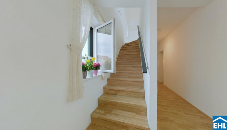 Die ruhige, grüne Umgebung punktet mit Naherholungsgebieten, Parks und guter öffentlicher Anbindung nach Wien. Schulen, Kindergärten und Einkaufsmöglichkeiten sind schnell erreichbar – ideal für den Alltag mit Kindern.