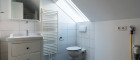 Im Obergeschoss erwartet Sie eine zentral angeordnete, offene Küche, ein wunderschöner großer Raum mit Zugang zur Loggia und vier weitere Zimmer. Diese können allerdings ohne großen Aufwand (Rigipswände) entfernt werden um z.B. zwei große Räume zu gestalten. Natürlich gibt es auch ein Bad und Toilette.