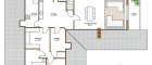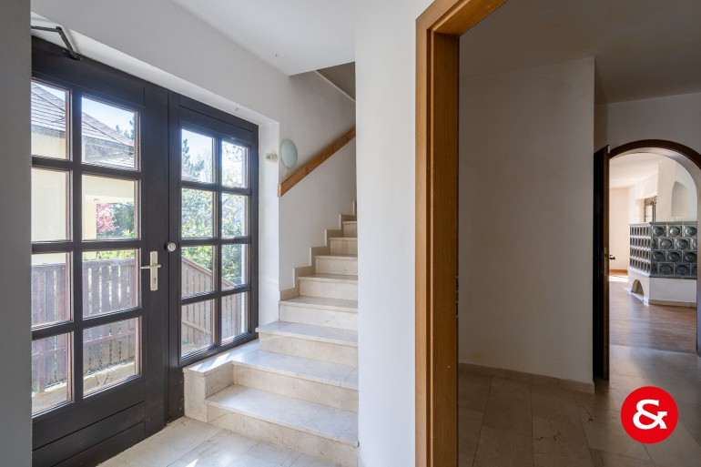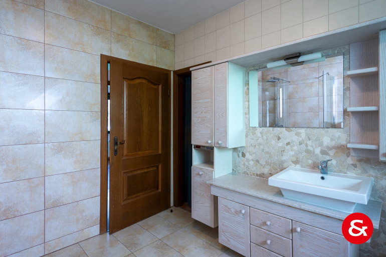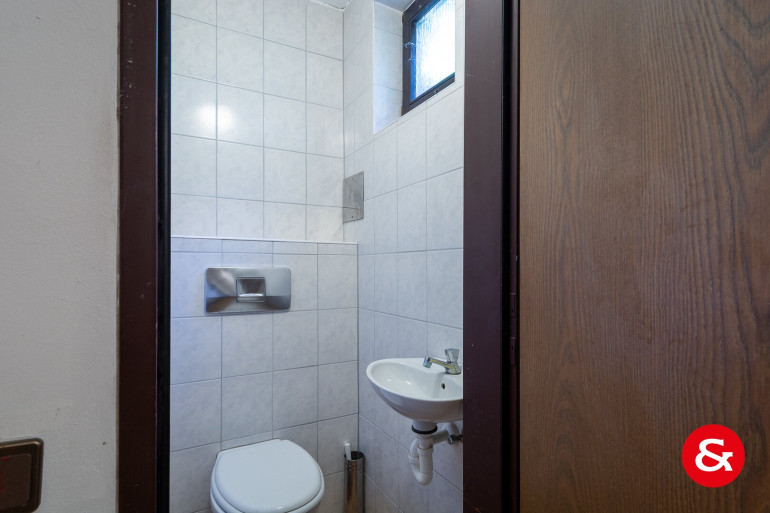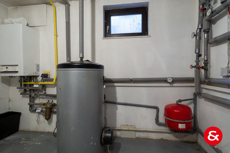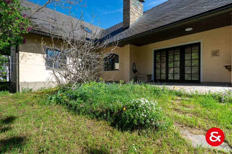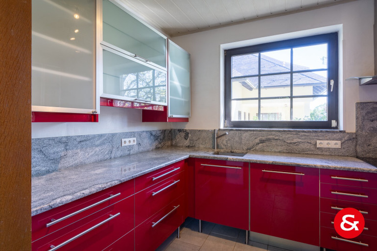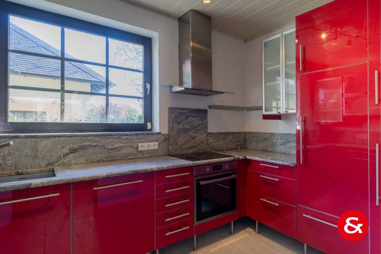 Im Erdgeschoß finden Sie einen Wirtschaftsraum, einer sehr großzügigen Wohnessbereich, eine moderne, getrennt von den anderen Räumlichkeiten situierte Küche, eine Gästetoilette, ein Badezimmer mit Fenster verbunden mit einer Garderobe und einem Schlafzimmer. Gegenüber dieser Räume befindet sich ein weiteres geteiltes, großes Zimmer, dessen beide Fenster einen Blick auf die Südwestterrasse zulassen.