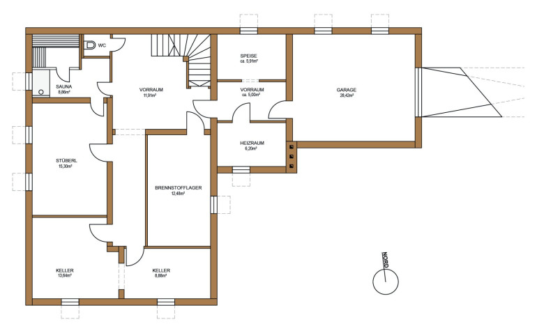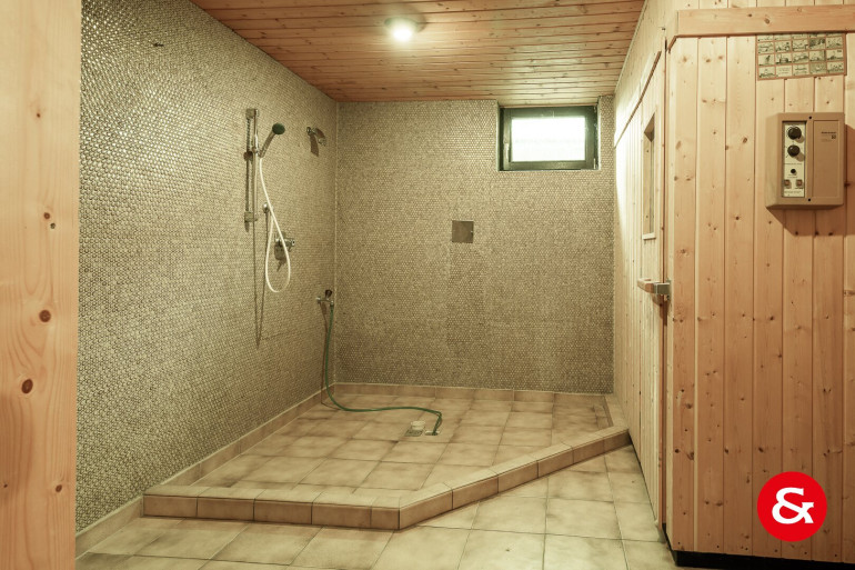 Im großzügigen Wohnkeller befinden sich mehrere Lagerräume, eine große Sauna mit Relaxzone, der Technikraum und eine 30m² große Garage mit elektrischem Tor.