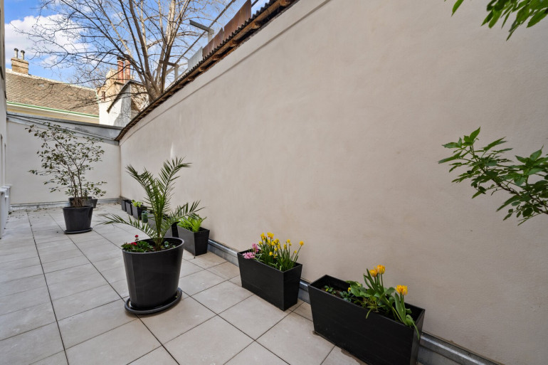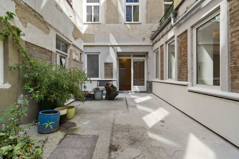 Über einen eleganten Gang gelangt man in einen ruhigen, lichtdurchfluteten Innenhof, in dem sich die zum Verkauf stehende Einheit befindet.