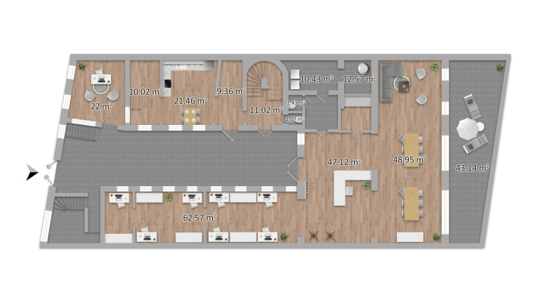 Die Immobilie verfügt über ca. 260 m² Nutzfläche und wird derzeit als Gewerbefläche mit Büroanteil genutzt. Ergänzt wird das Raumangebot durch eine eigene Außenfläche von ca. 43 m², die in die Gesamtfläche inkludiert ist – ein seltenes und besonders wertvolles Merkmal in innerstädtischer Lage.