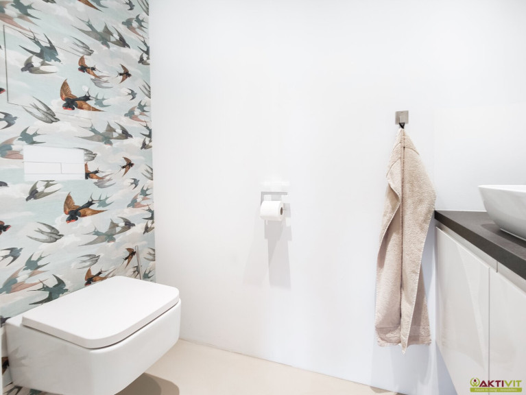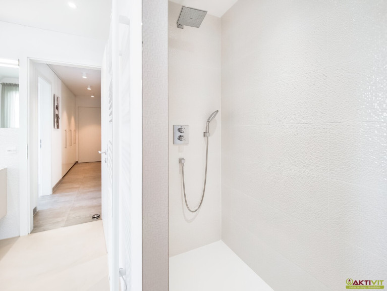 Das Badezimmer bietet hochwertiges Porzellan (Laufen), bodengleiche Duschen mit Echtglasabtrennungen, Badewanne und elegante Spiegel- und Lichtkonzepte.