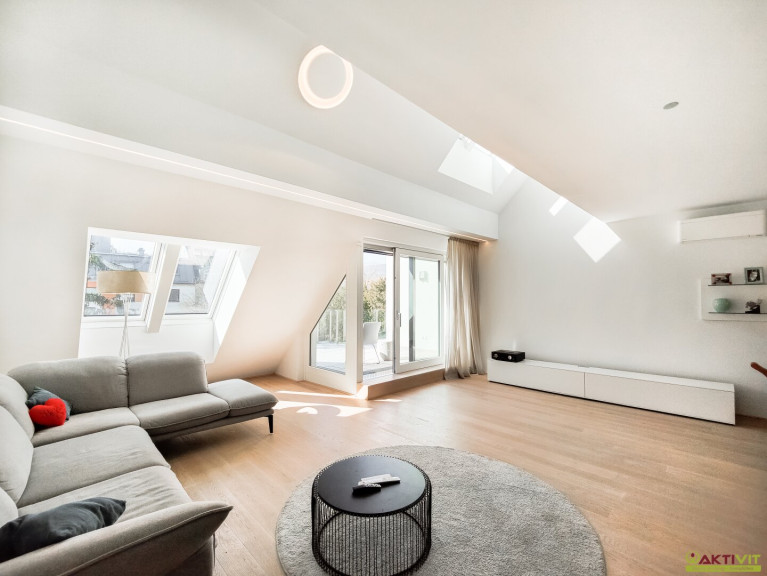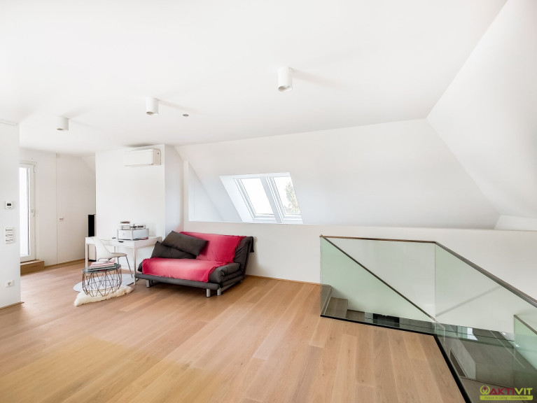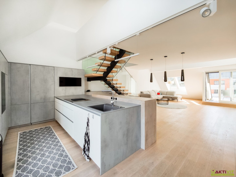 Das Penthouse erstreckt sich über das Dachgeschoss sowie die Galerieebene eines modernen Wohnhauses aus dem Jahr 2015. Es bietet eine klare, großzügige Raumstruktur mit offenem Wohn-Essbereich samt Designerküche, mehreren Schlafzimmern, zwei voll ausgestatteten Badezimmern, separaten WCs sowie einem großzügigen Galeriebereich, der sich hervorragend als Homeoffice oder Lounge eignet.