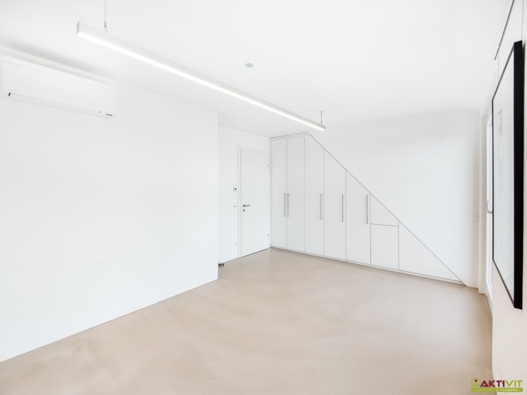 Sämtliche Räume sind zentral begehbar oder geschickt verbunden – eine architektonische Besonderheit ist die elegante, freitragende Treppe zur Galerie. Zwei Tiefgaragenplätze sowie ein Kellerabteil (ca. 4,5 m²) sind inkludiert.