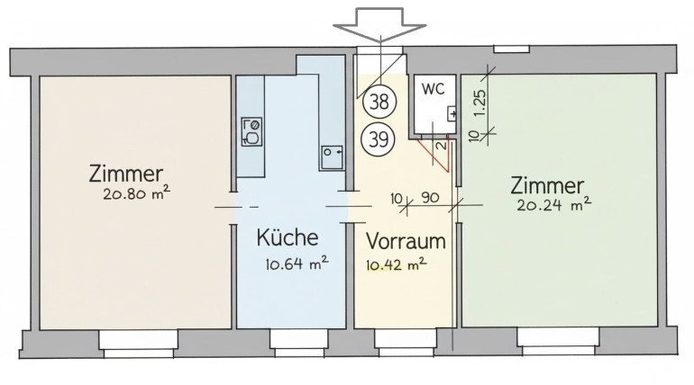 Ein Gang-WC befindet sich direkt gegenüber der Wohnungseingangstür. Ein Einbau eines WCs wäre somit überhaupt keine große Sache.