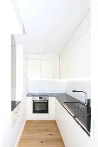Die Wohnung ist modern und hochwertig ausgestattet und verfügt über maßgeschneiderte Einbaumöbel.