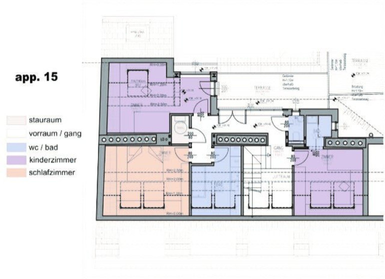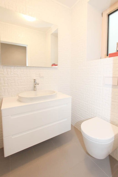 Eine stilvolle Treppe führt Sie in die obere Ebene, wo sich drei Schlafzimmer und zwei Badezimmer befinden – eines mit Dusche und das andere mit Badewanne sowie einem zusätzlichen WC. Von der oberen Etage aus haben Sie Zugang zu einer ca. 15 m² großen Terrasse, die zum Verweilen einlädt.