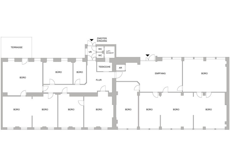 Betreten werden kann das Büro durch zwei Eingänge durch zwei separate Stiegenhäuser. Durch die zwei getrennten Eingangsbereiche ist es auch möglich, die Bürofläche zu teilen.