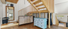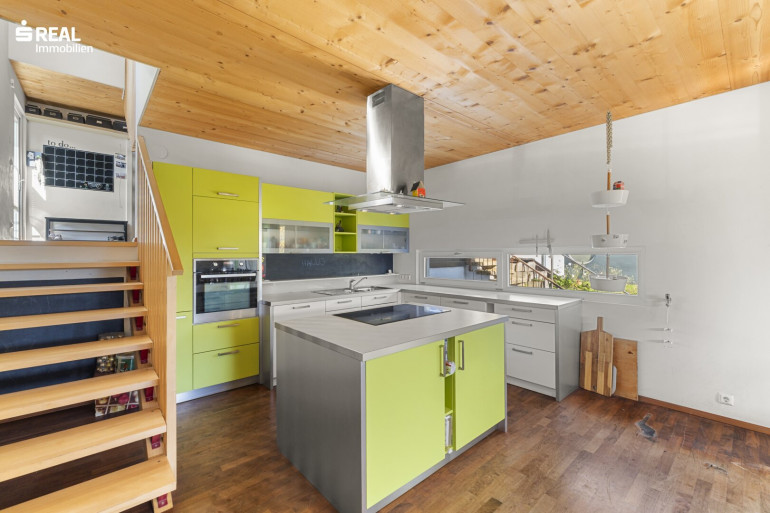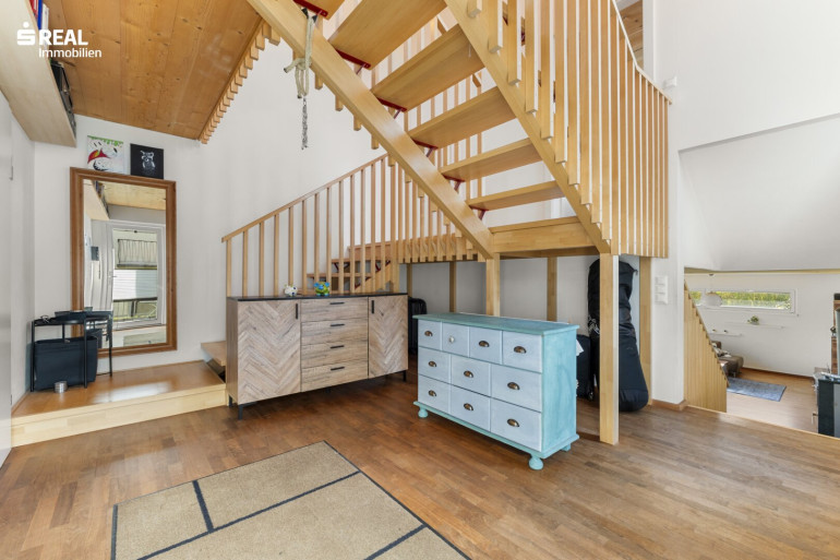 Der moderne Neubau mit Pultdach und BJ 2009 erstreckt sich über mehrere Etagen. Der Neubau wurde in hochwertiger CLT-Bauweise (Kreuzlagenholz) errichtet. Diese moderne Massivholzbauweise vereint ökologische Nachhaltigkeit mit exzellenter statischer Stabilität, hervorragendem Raumklima und natürlicher Wohnatmosphäre. Die Sichtholzdecken unterstreichen die warme und klare architektonische Linie. Dies sorgt für eine gemütliche offene Atmosphäre und schon beim Betreten der Immobilie kann man sich verzaubern lassen. Der lichtdurchflutete Vorraum mit Galerie, die offene Wohn-/Essküche mit großer Schiebetür in den Garten schaffen eine ganz besondere Wohnatmosphäre.