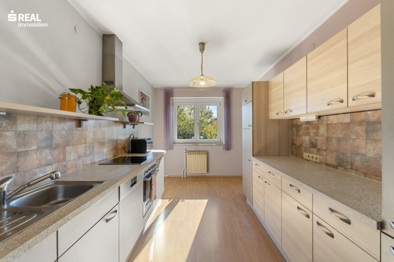 Das Innere des Hauses überzeugt durch hochwertige Materialien und eine durchdachte Raumaufteilung. Parkett sorgt für ein ansprechendes Wohnambiente, während die Fernwärme Zentralheizung für wohlige Wärme sorgt. Die moderne Einbauküche ist nicht nur funktional, sondern auch der perfekte Ort, um kulinarische Köstlichkeiten zu zaubern. Zudem kommt man von der großzügigen Wohnküche auch direkt auf die sonnige Südterrasse.