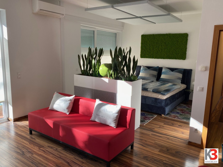 1 großer Wohnbereich mit Fernseher, Couch, Hydrokultur, ....