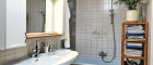Das Badezimmer mit Fenster und Badewanne ist großzügig dimensioniert und lädt zum Entspannen nach einem langen Tag ein.