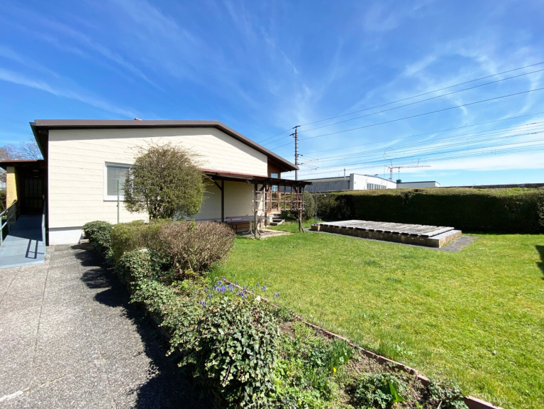 Die Garage befindet sich direkt an der Grundstücksgrenze. Durch ein großes Vordach wurde ein Carport geschaffen, der Platz für ein zweites Fahrzeug bietet.
