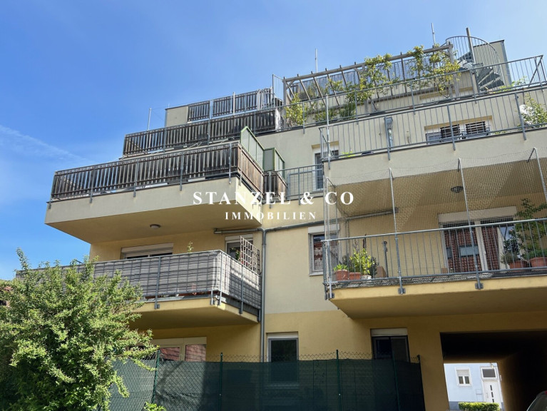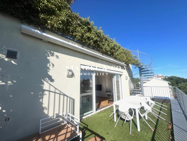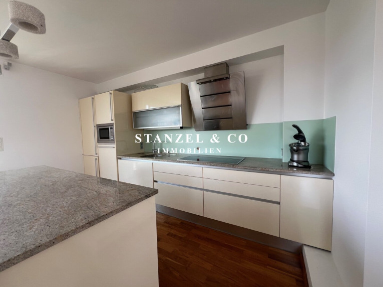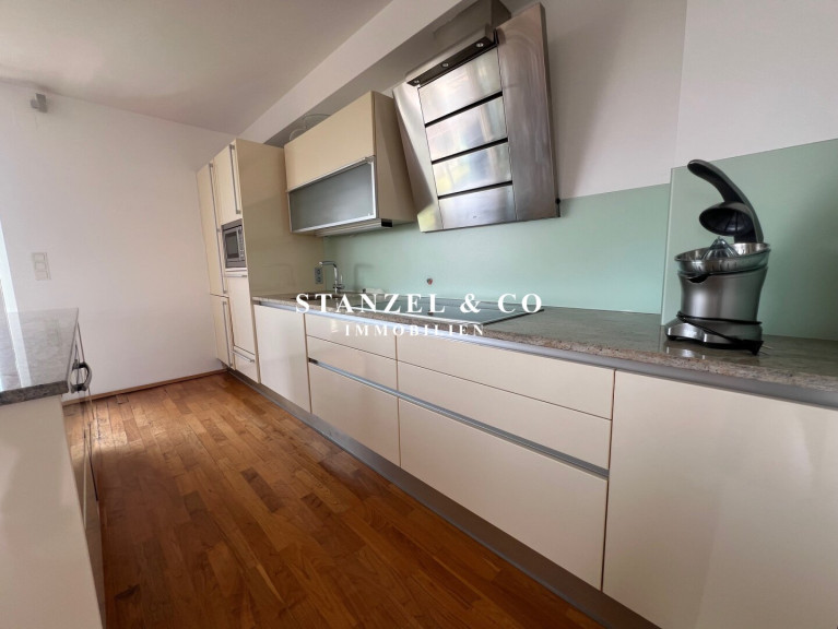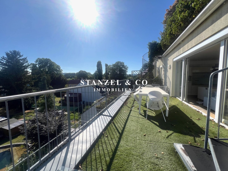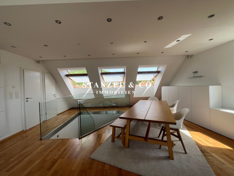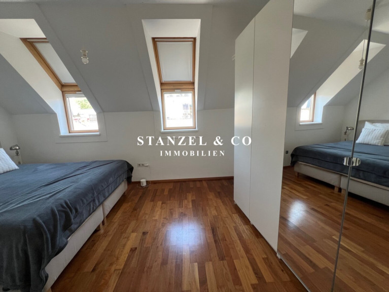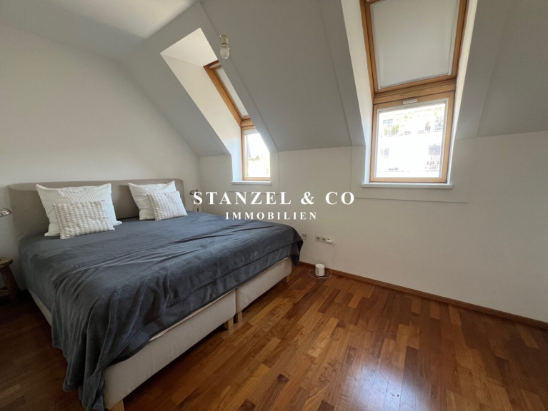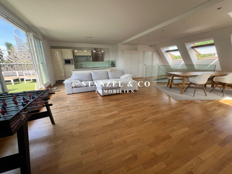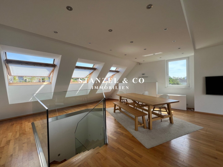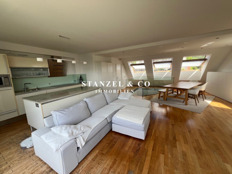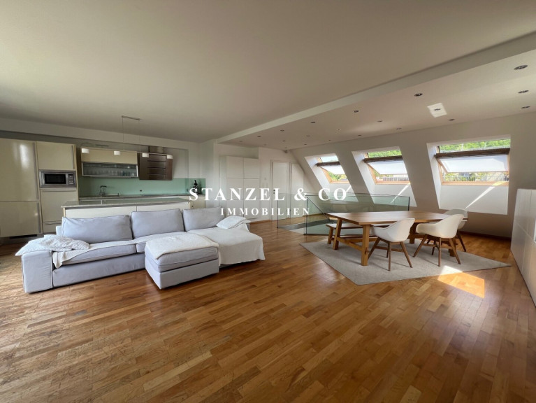 129m² Dachgeschoss-Maisonette in zentraler Grünruhelage, mit großzügigen 44m² Südwestbalkonen und 57m² großer Dachterrasse sowie PKW-Stellplatz.