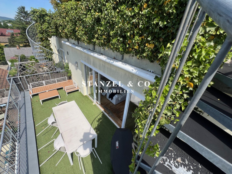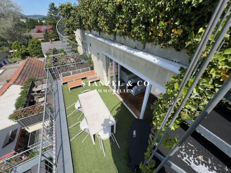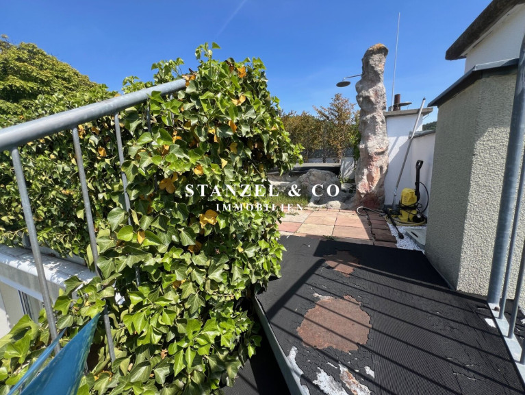 Der 26m² große südwestseitig orientierte Balkon verfügt über ausreichend Platz um einen Essplatz einzurichten und ist durch eine Wendeltreppe mit der schönen Dachterrasse verbunden.