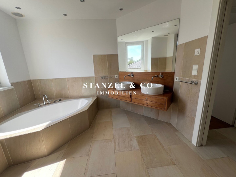 Das zweite Schlafzimmer ist 16m² groß und orientiert sich nach Osten. Das große Badezimmer ist mit einem Fenster, einer Eckbadewanne, einer Glasdusche + Regenduschkopf, Handtuchtrockner, Doppelwaschtisch + Unterschrank und Spiegel ausgestattet.