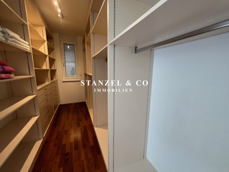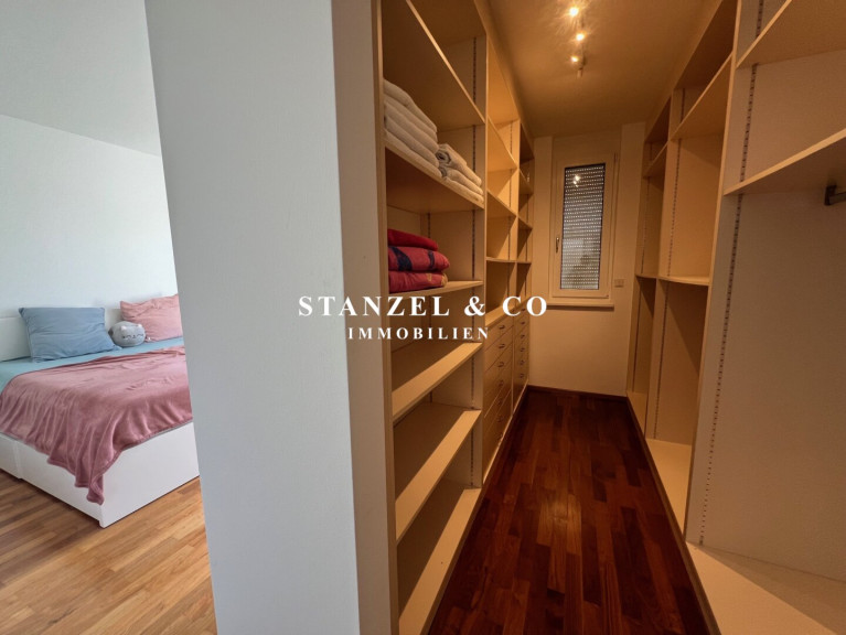 Vom Vorzimmer gelangt man in das 14m² große Schlafzimmer mit anschließendem 18m² großen, südwestseitigen Balkon und einer 9m² großen begehbaren Garderobe mit Tischlereinbauten.