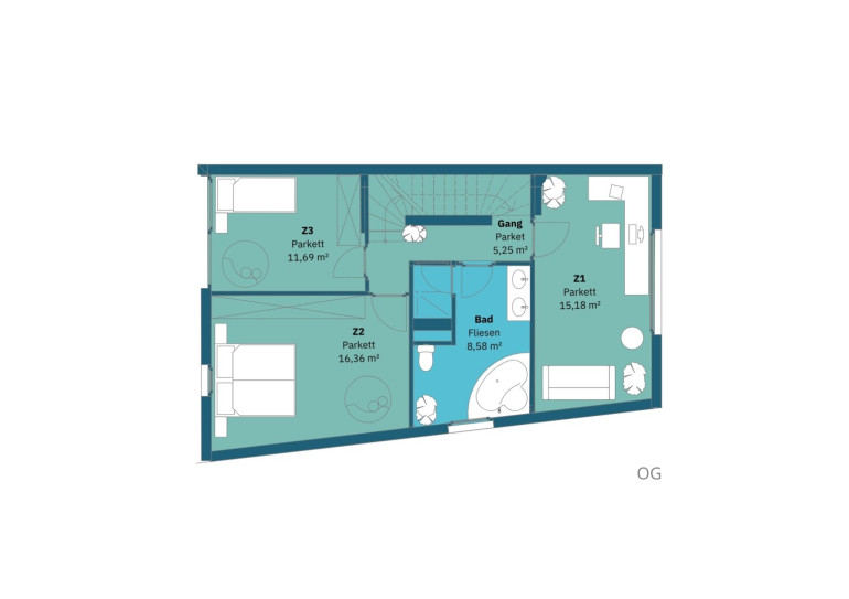 - 1. OG 58m² : 3 Schlafzimmer, Badezimmer & WC