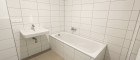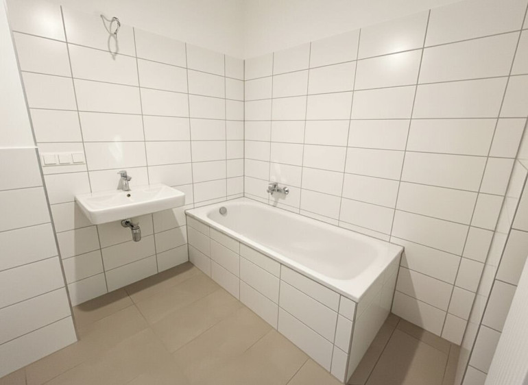 Das Badezimmer ist modern verfliest und mit einer Badewanne ausgestattet. Des Weiteren befinden sich ein Handwaschbecken, ein WC und ein Waschmaschinenanschluss im Badezimmer.