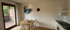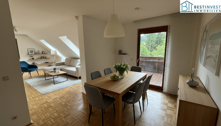 Die Küche mit Essbereich befindet sich in einem eigenen Raum welcher mit dem Wohnzimmer eine tolle Einheit bildet. Von hier aus gelangt man auch auf die große, vollständig überdachte Terrasse mit Abendsonne.