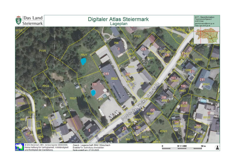 Nutzen Sie die Gelegenheit, zwei großzügige Grundstücke von insgesamt ca. 4.131 m² in der begehrten Gemeinde Wörschach zu erwerben. Auf ca. 2.079 m² befindet sich eine bestehende Immobilie, die vielseitige Nutzungsmöglichkeiten bietet. Die Immobilie kann sowohl als Wohnraum umgebaut werden als auch in eine Praxis oder Büroräumlichkeiten – ideal für Ihre Pläne, sich den Traum vom Eigenheim oder einer eigenen Geschäftsidee zu erfüllen.
