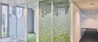 - Fassadenelemente im Rastermaß von 1,40 m mit öffenbaren Kippflügeln an jeder zweite Achse
