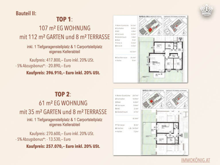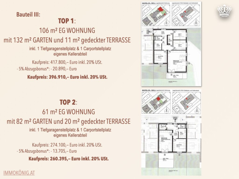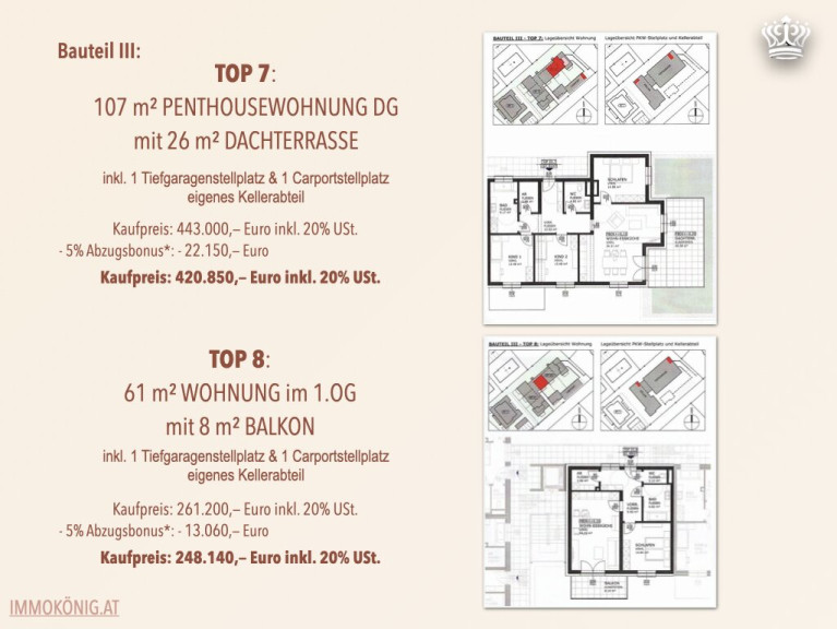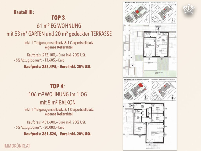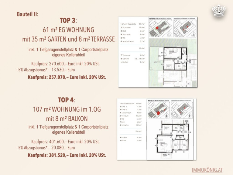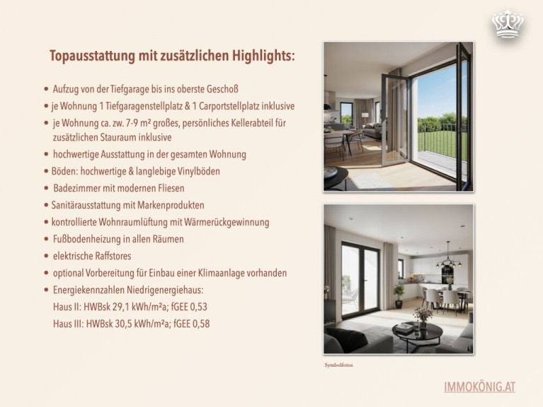 - inkludiert: 1 eigenes Kellerabteil, 1 Tiefgaragenstellplatz, 1 Carportstellplatz