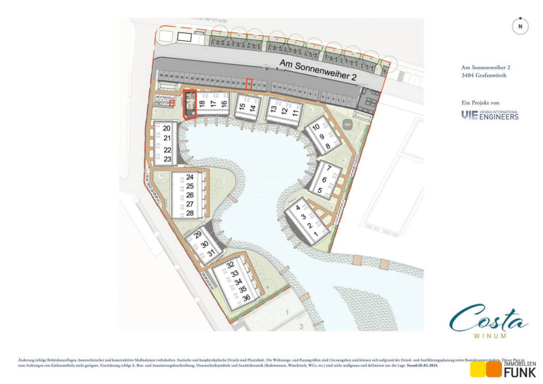 Sich den Traum vom Haus am See erfüllen und 365 Tage Urlaubsfeeling genießen. Das ist möglich im Sonnenweiher Grafenwörth, ca. 30 Fahrminuten von der Stadtgrenze Wiens entfernt, im Herzen der Region Wagram zwischen Wien und der Wachau. Ein nachhaltiges, gut durchdachtes Gesamtkonzept, erstklassige Architektur, hochwertige Ausstattung und viel Grünraum fördern das besondere Lebensgefühl am Sonnenweiher. Die Verkehrsanbindung Richtung Wien und Krems (S5, Stockerauer Schnellstraße) sowie nach St. Pölten (S33) ist ausgezeichnet. In der Gemeinde Grafenwörth gibt es ausreichend Einkaufsmöglichkeiten für Güter des täglichen Bedarfs, Kinderbetreuungseinrichtungen und Schulen. In diesem wunderbaren, regionalen Umfeld eingebettet, entstehen an einem mäanderförmig angelegten, ca. 36.000 m² großen See in mehreren Bauabschnitten insges. 170 Wohnimmobilien in Form von Einfamilien-, Doppel- u. Reihenhäusern im Eigentum sowie 36 kleine Seehäuser im Wohnungseigentum.