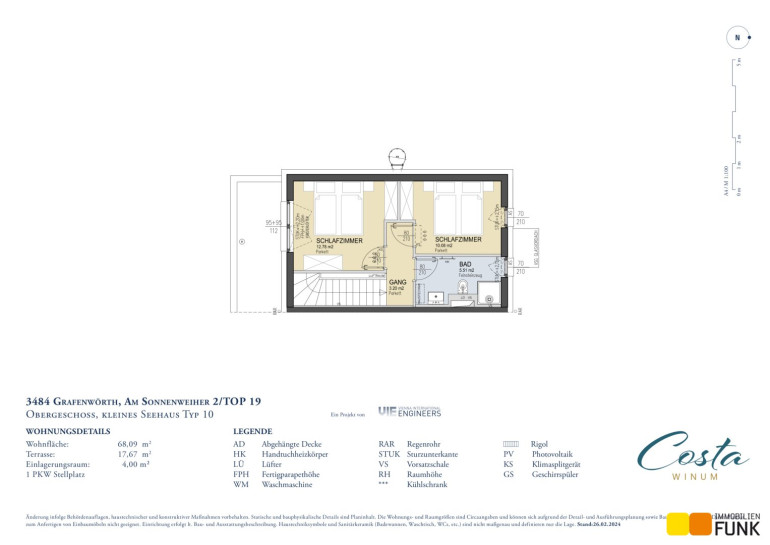 Unmittelbar bei der Zufahrt zu Am Sonnenweiher 2 finden Sie den zum Seehaus 19 gehörenden PKW-Abstellplatz. Von hier gelangen Sie über einen Zugangsweg zum Haus 19 mit dem dazugehörenden außenliegenden Einlagerungsraum nur wenige Schritte vom Hauseingang. Sie betreten das kleine Seehaus 19 in dem ca. 29,70 m² großen zentralen Wohnraum mit Zugang zur eigenen etwa 17 m² großen Lärchenholz-Terrasse mit Ihrem privatem Steg zum See. Linker Hand finden Sie das Gäste-WC und die Haustechnik. Unterhalb der Treppe, die Sie ins Obergeschoss führt, ist ein Abstellraum angeordnet. Im Obergeschoss erwarten Sie zwei Schlafzimmer (ca. 12,70 m² und 10 m²) und das etwa 5,50 m² großen Badezimmer mit Waschtisch, WC, Dusche, Fenster und Warmwasserspeicher.