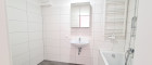 Rechts vom Eingangsbereich erwartet Sie ein stilvolles Badezimmer, ausgestattet mit einer Duschbadewanne und einem separaten WC – beide Nassräume sind elegant mit modernen Fliesen versehen. Für zusätzlichen Stauraum sorgt ein praktischer Abstellraum, ideal für nützliche Alltagsgegenstände.