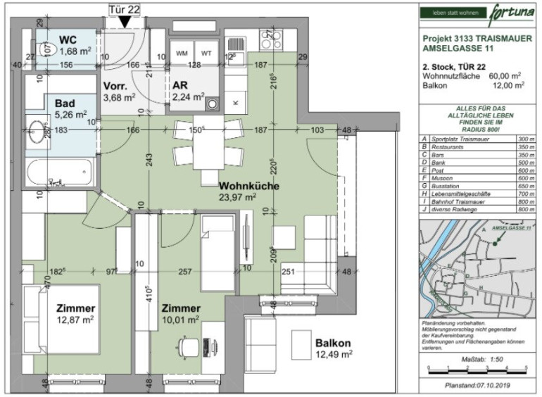 Das Gebäude selbst befindet sich in ruhiger Wohnlagen im Nordosten von Traismauer. In unmittelbarer Nähe finden Sie alles, was Sie für den täglichen Bedarf benötigen. Ärzte und Apotheken sind bequem zu Fuß oder mit dem Fahrrad erreichbar. Auch für Familien ist diese Lage ideal, denn sowohl eine Schule als auch ein Kindergarten befinden sich in der Nähe. Ihre Einkäufe können Sie bequem in einem Supermarkt und einer Bäckerei erledigen, die ebenfalls nur wenige Gehminuten entfernt sind.