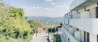 Die Wohnungen sind umgeben von Grünflächen und Weingärten.