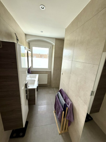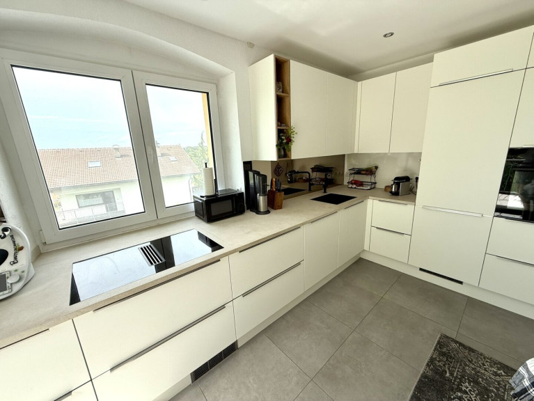 Die moderne Einbauküche wurde 2021 eingebaut und ist das Herzstück der Wohnung. Das Badezimmer ist mit einem Fenster ausgestattet, was für eine angenehme Belüftung sorgt, und bietet eine komfortable Dusche sowie ein separates Gäste-WC.